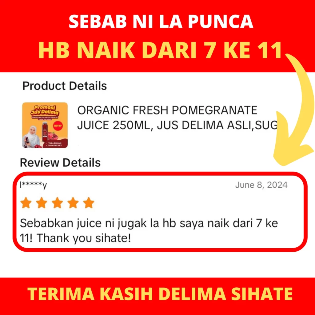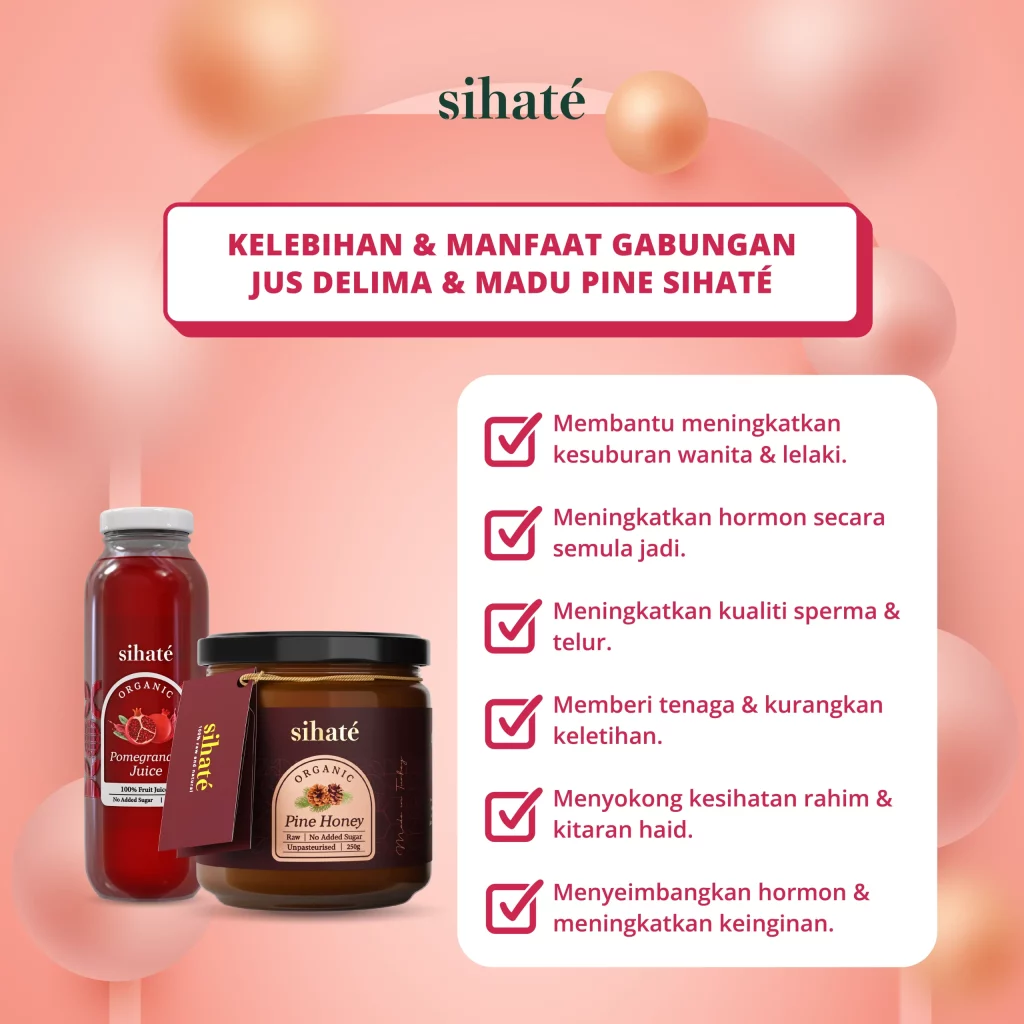 Semua produk keluaran Sihaté adalah asli dan organik tanpa sebarang campuran pewarna, pengawet dan bahan-bahan lain. Anda boleh menyemak semua sijil akuan bagi Jus Delima keluaran Sihaté pada pautan ini.