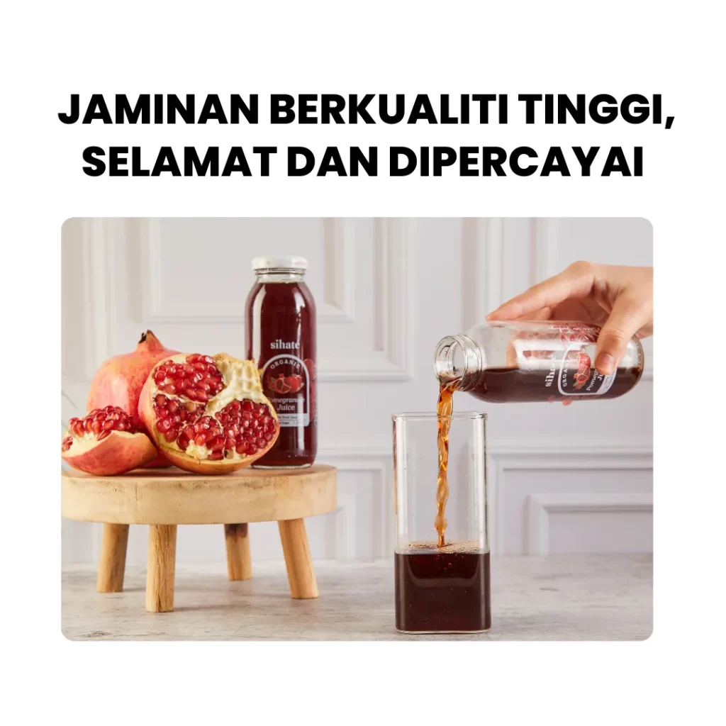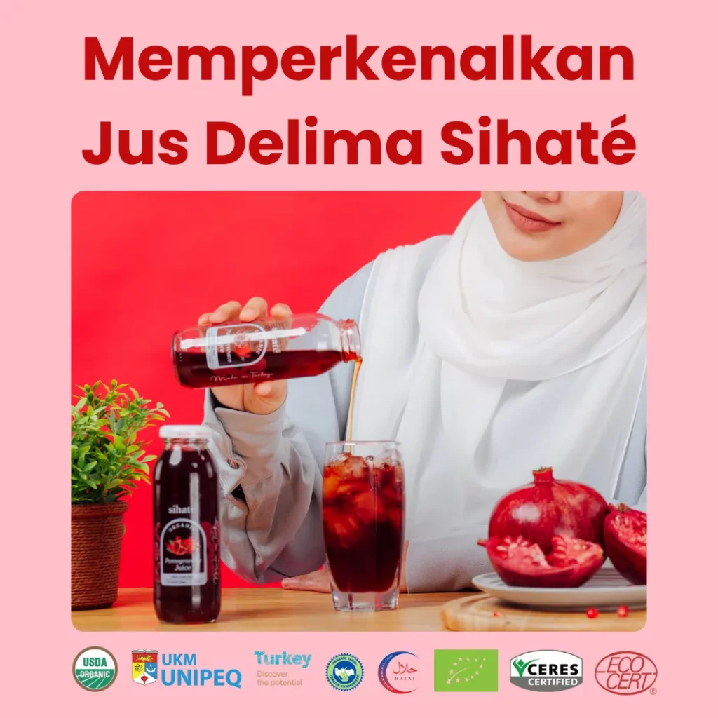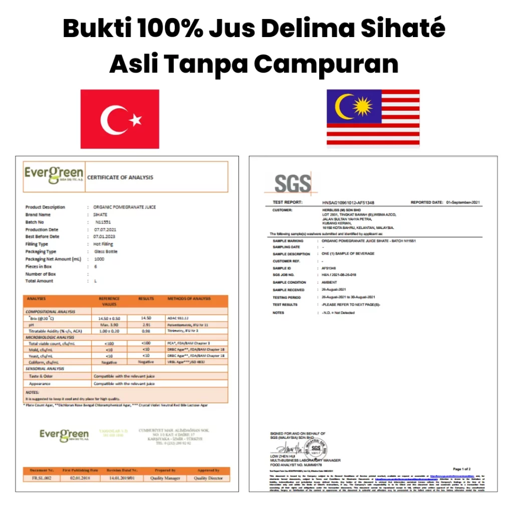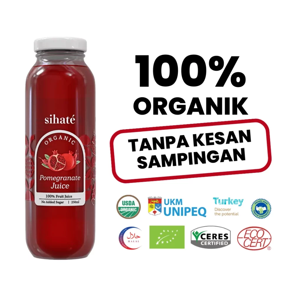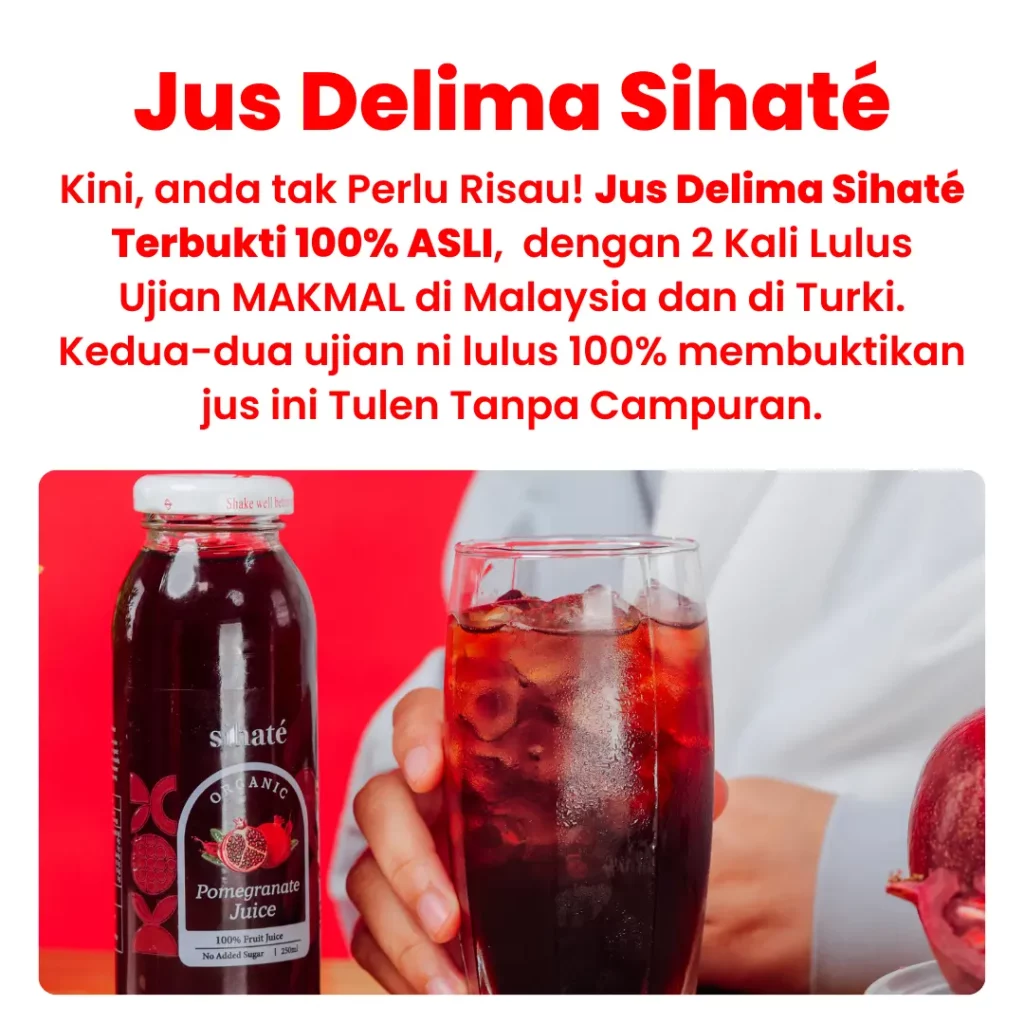 Semua produk keluaran Sihaté adalah asli dan organik tanpa sebarang campuran pewarna, pengawet dan bahan-bahan lain. Anda boleh menyemak semua sijil akuan bagi Jus Delima keluaran Sihaté pada pautan ini.