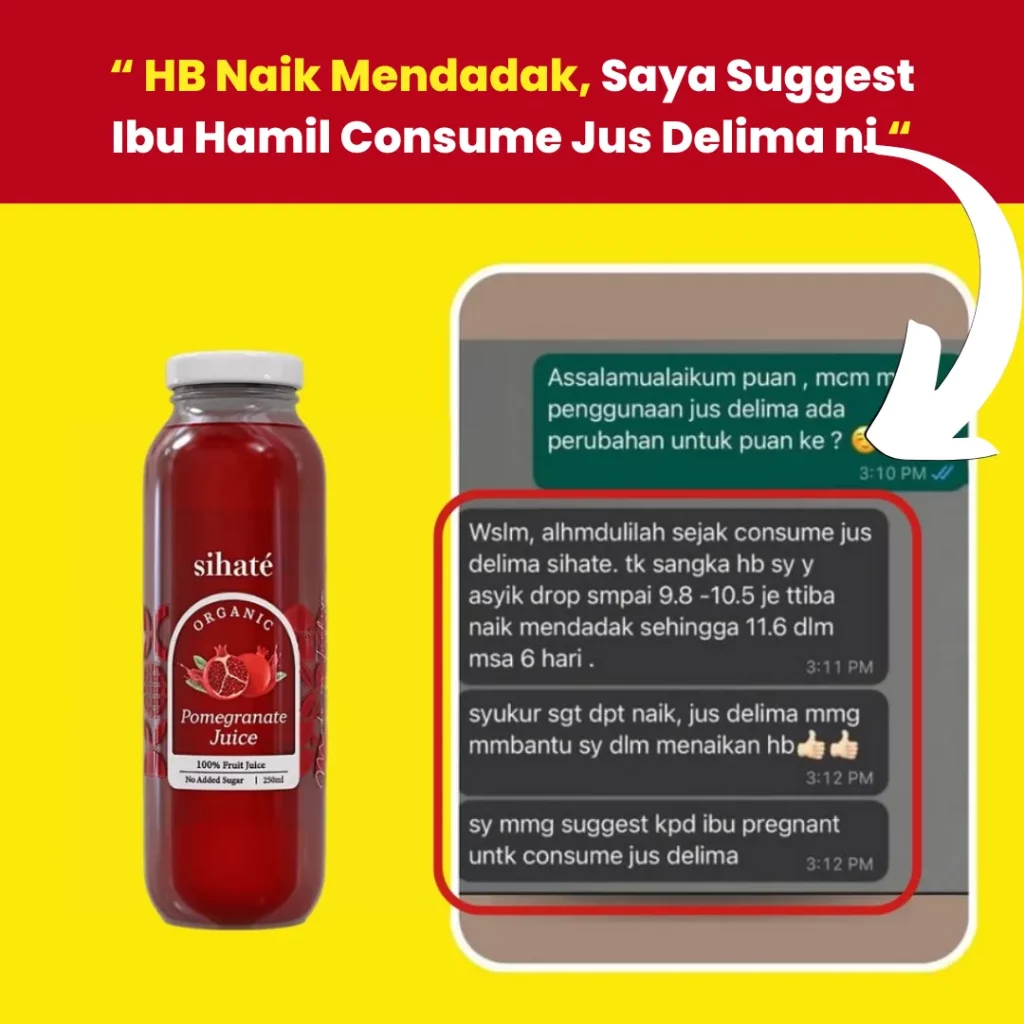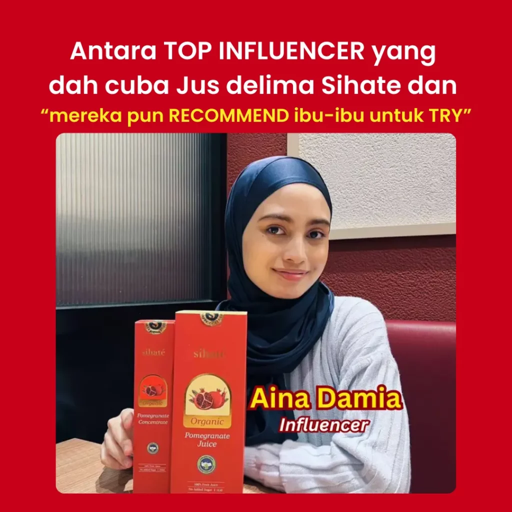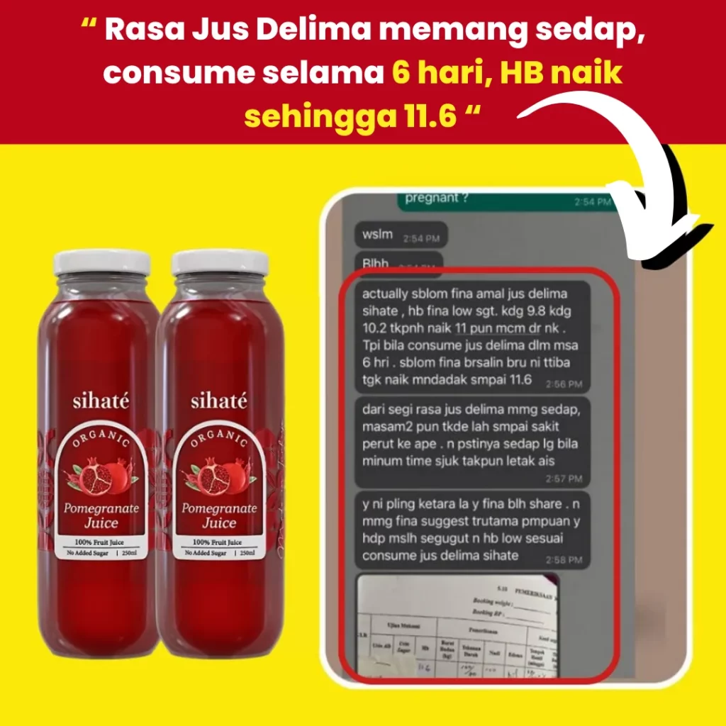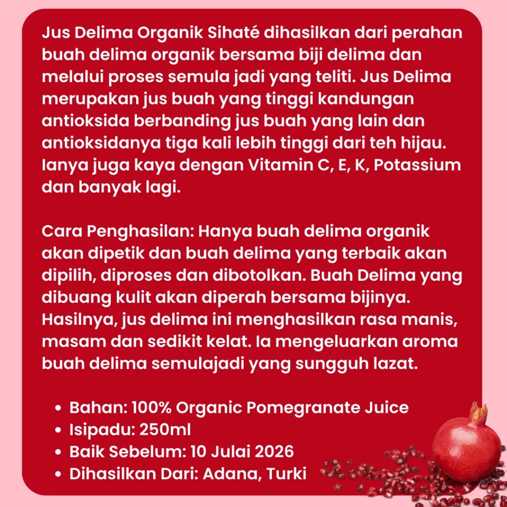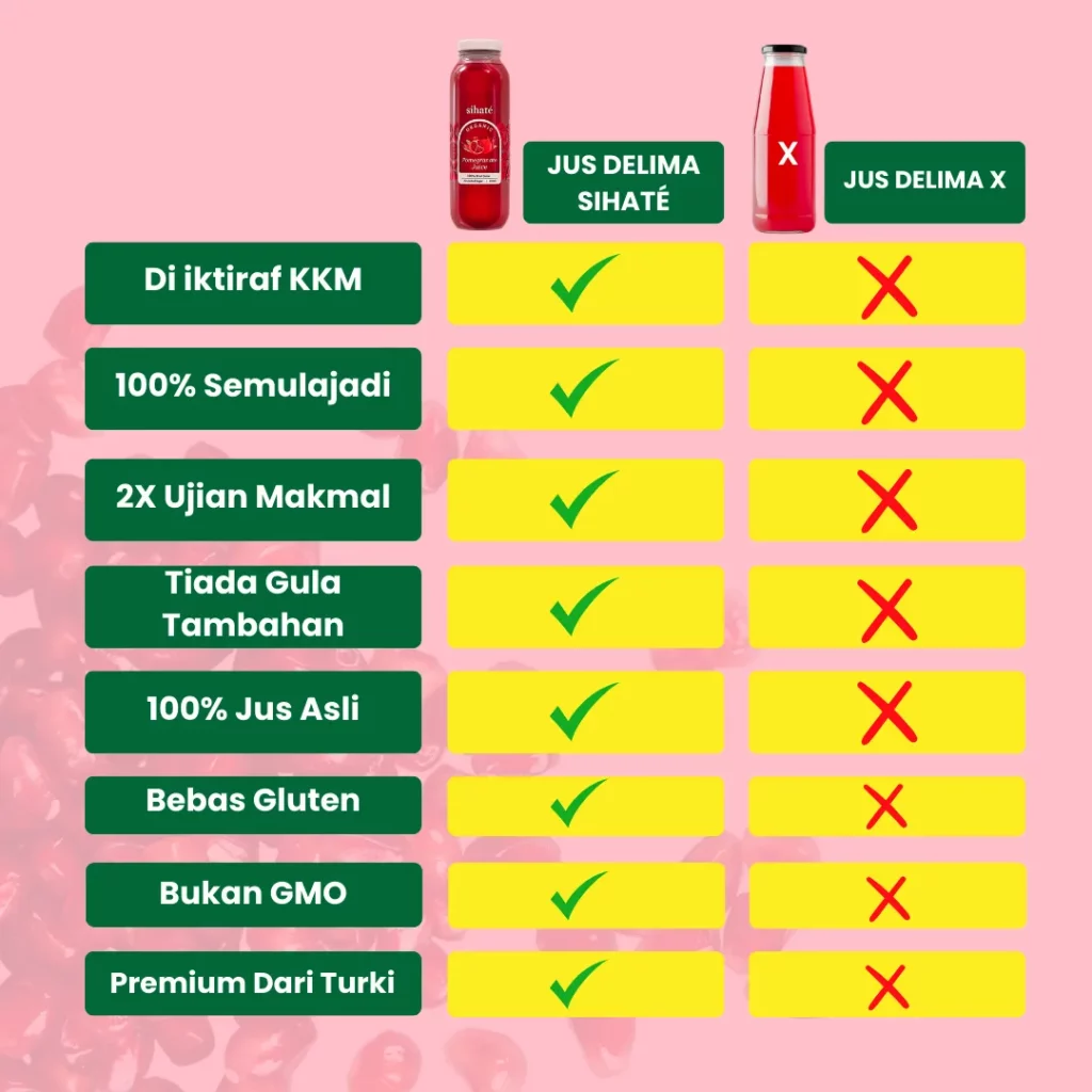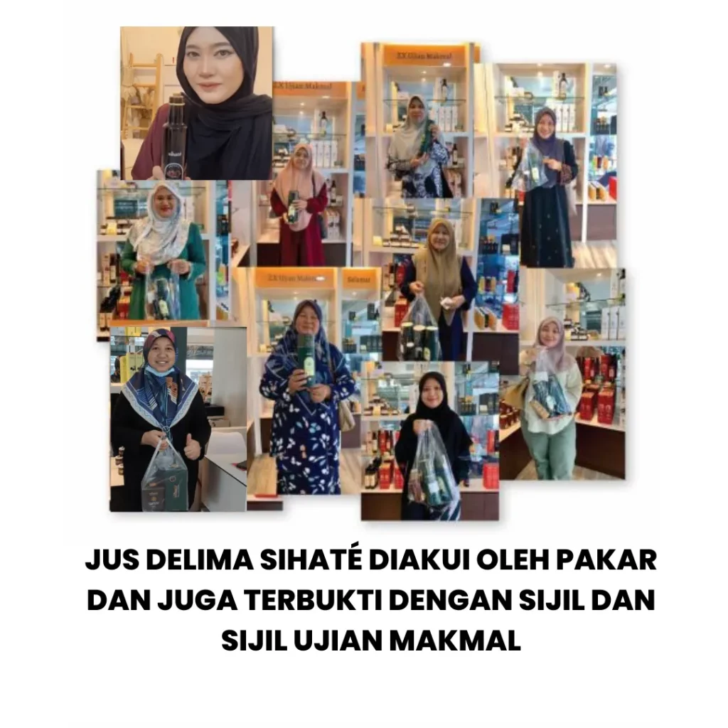 Semua produk keluaran Sihaté adalah asli dan organik tanpa sebarang campuran pewarna, pengawet dan bahan-bahan lain. Anda boleh menyemak semua sijil akuan bagi Jus Delima keluaran Sihaté pada pautan ini.