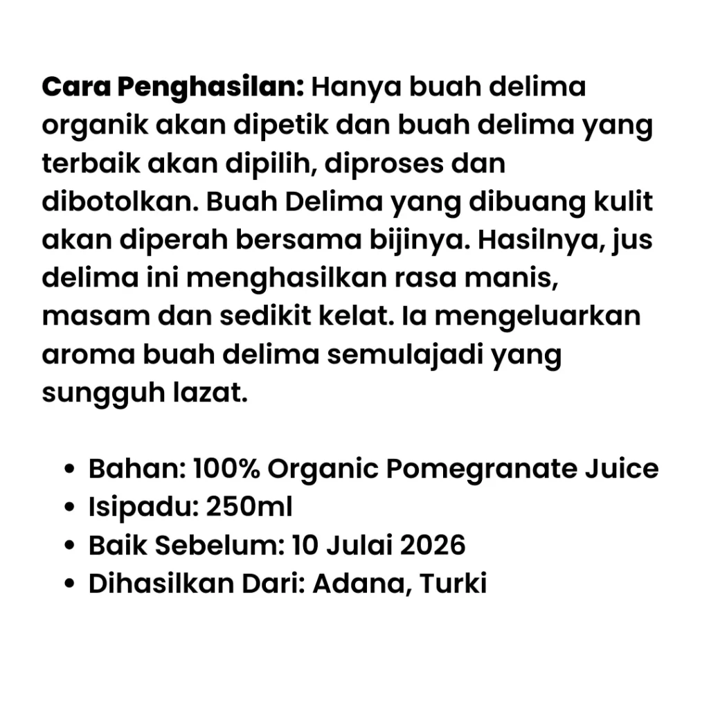 Gula yang terhasil di dalam jus ini merupakan gula semulajadi dari asal buah delima dan bukannya penambahan gula luar. Anda akan dapat menikmati rasa sebenar jus ini.