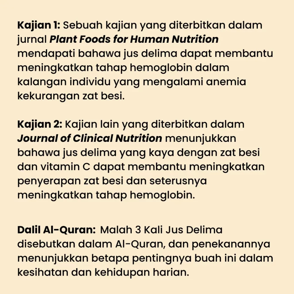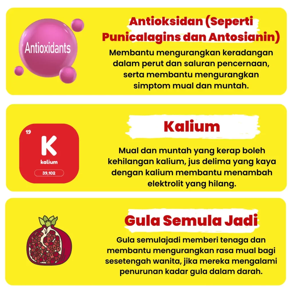 - Jus delima lebih baik diamalkan dengan makanan yang neutral atau ringan. Elakkan pengambilan bersama makanan pedas atau berlemak yang boleh memperburuk simptom gastrik.